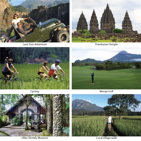 Around the area you can find many tourist activities such as Prambanan temple or golfing at the Merapi Golf. Relax and enjoy the day while surrounded with spectacular views of the Mount Merapi & the Indian Ocean.
